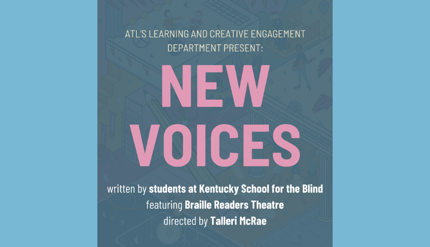 Actors Theatre of Louisville’s Learning and Creative Engagement Department is proud to present New Voices, featuring original 10-minute plays written by students at the Kentucky School for the Blind and performed by Braille Readers Theatre. These staged readings celebrate emerging young playwrights, developed through ATL’s New Voices residency program. The plays were created under the instruction of teaching artists Joy Lanceta Colonel and Katie Peña-Van Zile, and will be brought to life under the direction of Talleri McRae. Join us for an afternoon that uplifts student voices and showcases the power of theatre to expand access and imagination. This performance will include a Q&A with the playwrights and actors.